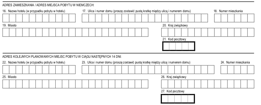 - adres pobytu w Niemczech – nazwa hotelu (w przypadku pobytu w hotelu), ulica i numer domu, numer mieszkania, miasto, kraj związkowy, kod pocztowy,