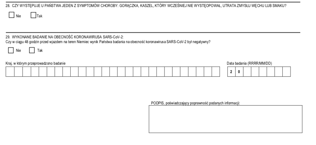 22 października 2020 r. niemiecki Instytut Roberta Kocha uznał Polskę za teren zagrożony. Osoby wyjeżdżające z Polski do Niemiec muszą odbyć 14-dniową kwarantannę lub przedstawić negatywny wynik testu na koronawirusa, wykonany w ciągu 48 godzin przed wyjazdem. Równie ważną kwestią jest wypełnienie karty wjazdowej do Niemiec, tzw. Aussteigekarte.